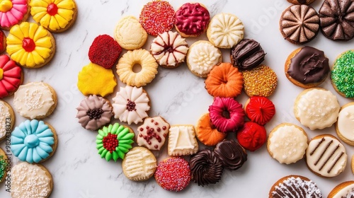 A vibrant assortment of colorful cookies arranged in a circular pattern, showcasing various shapes and delicious designs.
