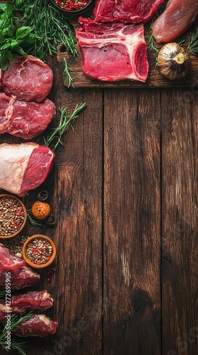 A vibrant assortment of fresh pork and beef cuts is showcased on a rustic wooden table. Fresh herbs and spices accompany the meats, inviting culinary creativity in a cozy kitchen