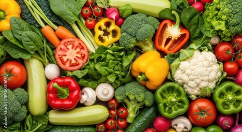 A vibrant assortment of fresh vegetables and fruits, including carrots, tomatoes, broccoli, cauliflower, and bell peppers, arranged in a colorful and healthy display.