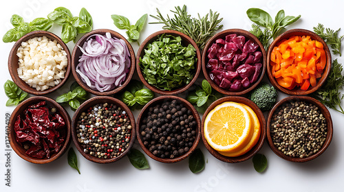 A vibrant assortment of fresh vegetables, herbs, and spices arranged around a white background, leaving space for text or design. The image represents healthy eating, organic food, and culinary creati