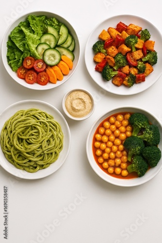 A vibrant assortment of healthy dishes including pasta, vegetables, and hummus, perfect for promoting nutrition, meal prep, or healthy eating campaigns.