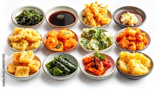 A vibrant assortment of twelve small bowls filled with various fried foods, vegetables, and dipping sauces, presented on a white background.