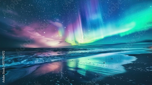 vibrant, aurora, night, sky, beach, green, purple, blue, wave, serene, ocean, calm, sand, glowing, surreal, ambience, illumination, colours, light, dancing, water, peaceful, beauty, nature, horizon, star, magical, tranquil, atmosphere, celestial