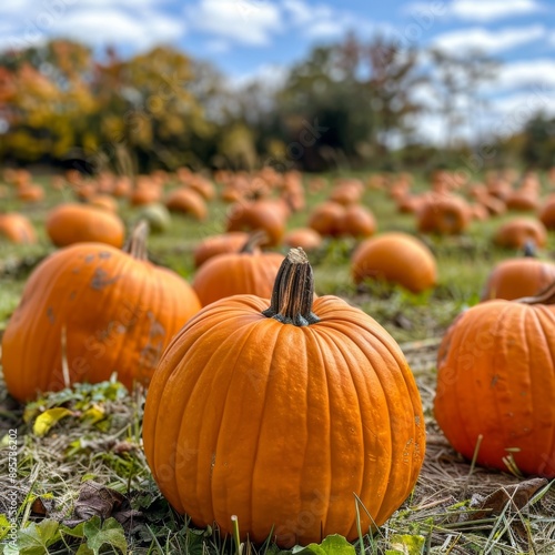 A vibrant autumn pumpkin patch filled with large orange pumpkins set against a natural background. AI generated image.