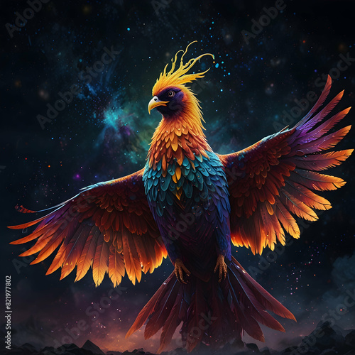 A vibrant bird, possibly a phoenix, spreads its wings wide in a majestic display. The wings are adorned with a multitude of colorful dots, each glowing radiantly