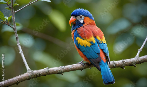 parrot, bird, blue, orange, yellow, green, feather, tree branch, tree, forest, wildlife, nature, tropical, exotic, animal, avian, fauna, sitting, tail, beak, plumage, jungle, rainforest, wild, beautiful, colourful, vibrant, bright, outdoors, closeup, portrait, macro, birding