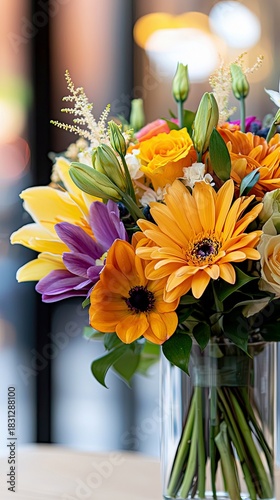 A vibrant bouquet of flowers in a clear glass vase, with a blurred background suggesting an indoor setting and soft lighting.