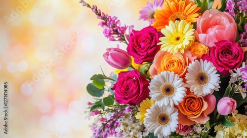 A vibrant bouquet of mixed garden flowers including roses, daisies, and tulips, arranged elegantly on a light solid color background, with ample copy space
