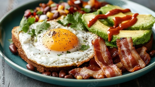 A vibrant breakfast platter featuring a sunny-side-up egg, crisp bacon, fresh avocado slices, and colorful ingredients, inviting a delicious start to the day.
