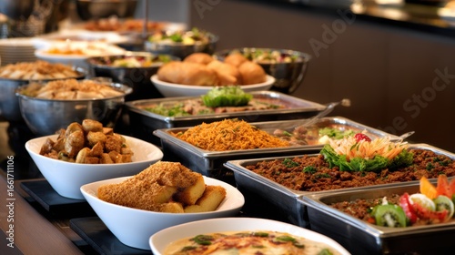 A vibrant buffet spread featuring various delicious dishes, salads, and appetizers in a modern dining setting