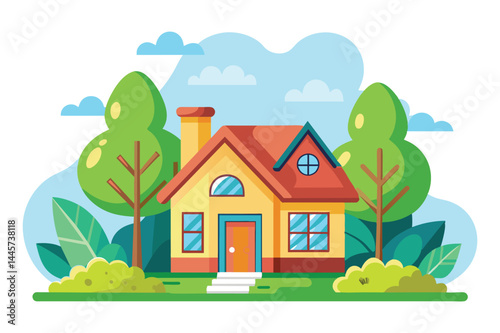 house, cartoon, colourful, tree, greenery, residential, cheerful, sky, plant, architecture, design, illustration, landscape, bright, sunny, environment, nature, home, roof, door, window, path, landscaping, cosy, peaceful, scene, beautiful, idylli, friendly, serene, decorative, colours, charming, backyard, foliage, architectural, property, vibrant, high-coloured, drawing, style, bungalow, escape, calmness, happiness, warmth, scenery, family