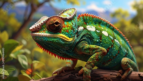 A vibrant chameleon perches on a branch with colorful skin. Its eyes are focused. Lush greenery surrounds it with a backdrop of a blurred forest and mountains