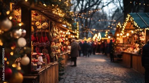 A vibrant Christmas market with vendors selling handcrafted gifts, glowing string lights, and festive garlands. --ar 16:9 --v 6.1 Job ID: 5e26f9dd-68bb-4594-b335-178dd723277f