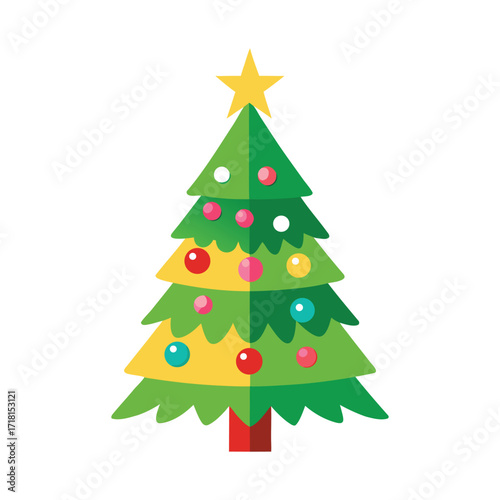 A vibrant Christmas tree stands tall, decorated with colorful ornaments and topped with a radiant star, embodying the festive spirit of the holiday season.