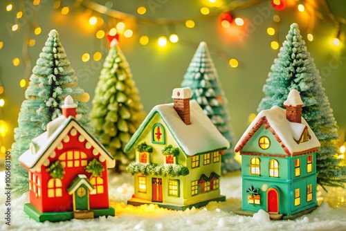 A vibrant Christmas village scene with colorful snow-covered houses and decorated trees. Bright lights create a festive atmosphere, capturing the joy and warmth of the holiday season.
