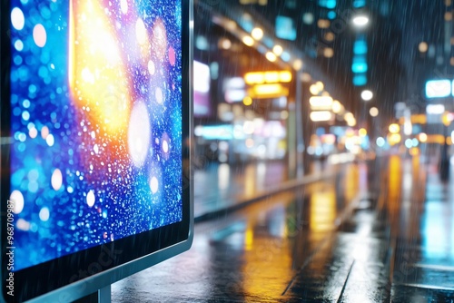A vibrant city scene with a glowing monitor displaying colorful lights and a rainy street capturing urban nightlife.