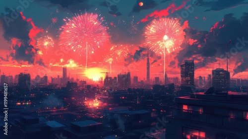fireworks, sunset, city landscape, skyline, celebration, visual, nightlife, magical, awe, moment, spectacular, excitement, illumination, dynamic, atmosphere, glow, enjoyment, vibrant, light, photo, stunning, festival, joy, horizon, festive, event, colours, artistic, party, life events, scene, charme, happiness, thrill, night, energy, scenic, spectacle, modern, art, urban, design, creative, beauty, nature, summer, architecture, landscape