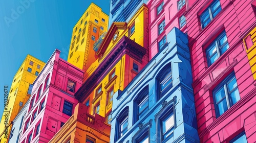 A vibrant cityscape with colorful buildings reaching towards a bright blue sky. The photo evokes a sense of energy and optimism.