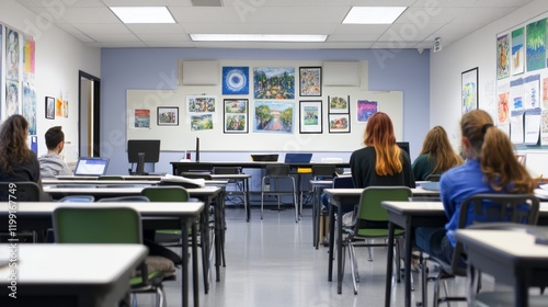 A vibrant classroom setting where students practice visual communication techniques through presentations and art,