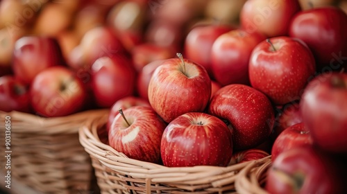 A vibrant close-up image of fresh apples placed in vintage wicker baskets, showcasing the rich reds and subtle yellows of the fruit, ready for sale or consumption.