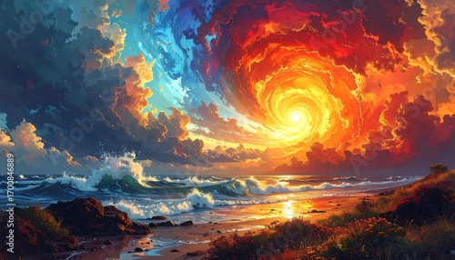 A vibrant coastal scene, featuring a swirling vortex of colors in the sky above a tranquil beach.