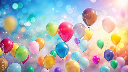 A vibrant collection of colorful balloons floats joyfully against a shimmering, bokeh-filled background, celebrating festivity and happiness.