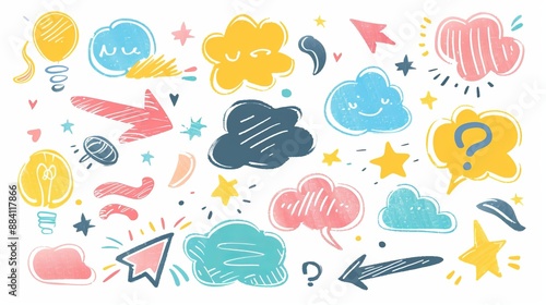 A vibrant collection of colorful doodles featuring various shapes such as clouds, arrows, stars, and question marks in a playful artistic style.