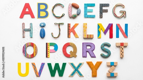 A vibrant collection of painted wooden letters arranged in alphabetical order against a clean white background. Bright colors and craft textures evoke learning, creativity, and playful education for c