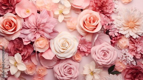 A vibrant collection of pastel pink and peach paper flowers arranged artfully. Detailed textures and soft hues create a delicate, romantic aesthetic
