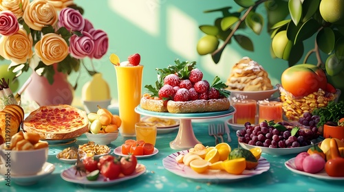 A vibrant, colorful feast featuring a variety of fruits, desserts, and drinks, creating a cheerful atmosphere.