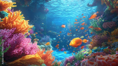 ocean, sea, underwater, reef, coral, fish, marin, aquatic, tropical, blue, colourful, vibrant, orange, yellow, pink, purple, green, life, environment, ecosystem, depth, sunlight, shimmering, algae, plant, beauty, serene, calm, natural, wildlife, fauna, schooling, swimming, illustration, art, view, scene, background, texture, pattern, detail, diversity, habitat, exploration, biology, water, clear, tranquil
