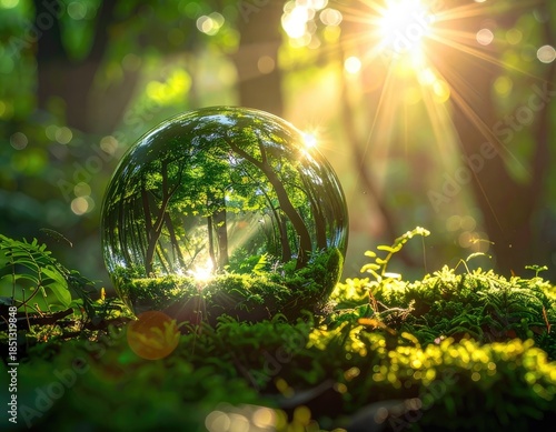 crystal ball, forest, nature, sunlight, moss, greenery, outdoors, bright, magical, fantasy, depth of field, bokeh, macro, timberland, vibrant, environment, ecology, earth, orb, sphere, sun ray, glowing, verdant, tranquil, serene, closeup, natural light, optic, illusion, conservation, growth, daylight, foliage, closeup, atmospheric, dreamlike, artistic, spiritual, pristine, botany, luminescence