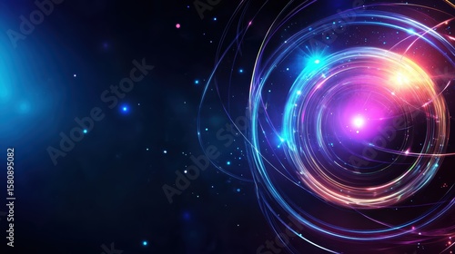 A vibrant digital artwork depicting glowing, swirling light trails and bright orbs against a dark cosmic background.