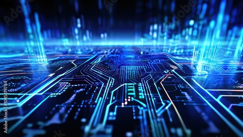 A vibrant digital circuit board with glowing blue lines, representing technology and innovation.