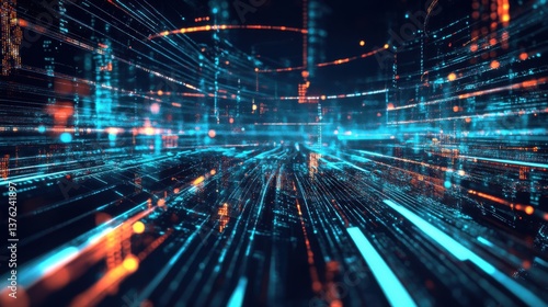 A vibrant digital landscape with blue and orange lines creating a sense of depth and motion, representing technology and data flow.