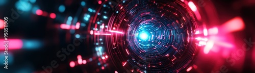 A vibrant digital tunnel filled with glowing blue and pink lights, symbolizing advanced technology and futuristic concepts.