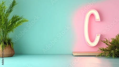 A vibrant display featuring a large neon letter 'C' illuminated against a pastel wall, flanked by tropical plants, combines modern artistic decor elements.