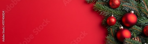 A vibrant display of Christmas decorations against a red backdrop, offering a festive atmosphere and ample space for personalized messages or greetings.