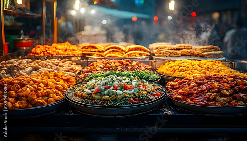 A vibrant display of diverse street food offerings at a bustling market