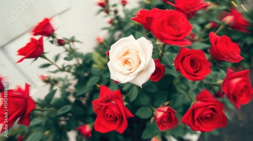 A vibrant display of red and white roses flourishes in a lush garden, symbolizing love and beauty for Valentine's Day, birthdays, and various celebrations