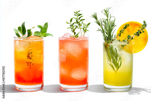 A vibrant display of three refreshing cocktails garnished with fresh herbs, perfect for summer gatherings.