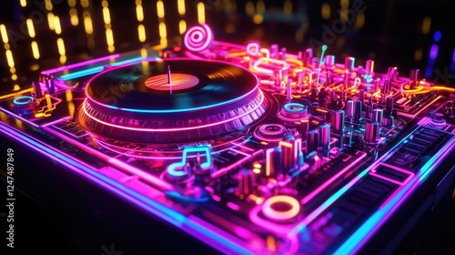 turntable, vinyl, music, dj, neon, light, sound, party, nightlife, audio, equipment, mixer, rythm, beat, technology, entertainment, dance, club, performance, creativity, art, colours, design, visual, vibe, energy, atmosphere, innovation, culture, soundboard, mixing, electronic, festival, celebration, soundwaves, groove, track, disc, studio, setup, ambience, artistry, showcase, event