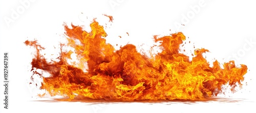 A vibrant, dynamic depiction of flames in shades of yellow, orange, and red, against white
