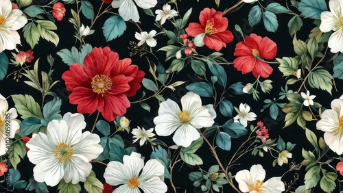 A vibrant floral pattern featuring red, white, and green flowers on a dark background.