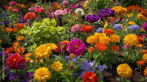 A Vibrant Garden of Colorful Flowers in Full Bloom with a Variety of Petal Shapes and Colors on a Sunny Day