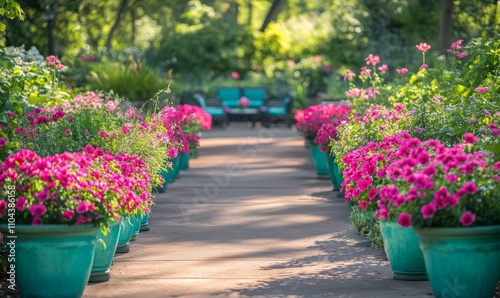 A vibrant garden path lined with bright pink flowers in turquoise pots, leading to a cozy sunlit seating area in the background.