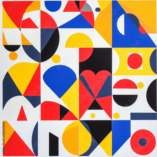 A vibrant geometric pattern with triangles, circles, and squares in bold primary colors, white background