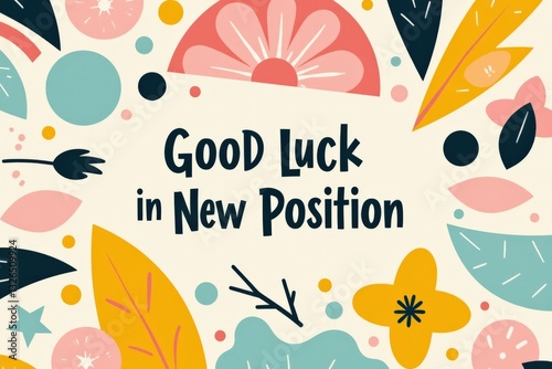 good, luck, new, position, card, floral, leaf, vibrant, colourful, congratulation, job, career, design, motif, greeting, celebration, success, positive, bright, inspiration, art, handcraft, personal, decorative, message, style, nature, creative, joyful, empowerment, fresh, modern, friendly, happy, symbolic, custom, festive, aesthetic, cheerful, graphic, colours, theme
