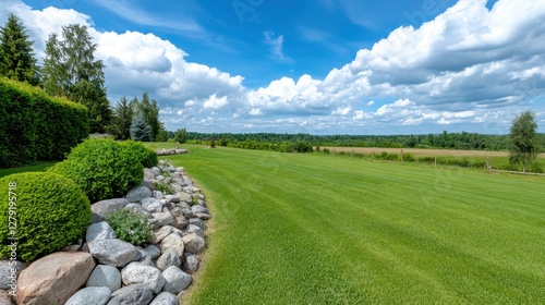A vibrant green lawn extends to a distant horizon under a bright blue sky with fluffy white clouds. A rock wall and manicured shrubs are in the