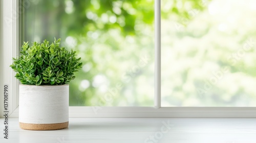 A vibrant green potted plant on a windowsill brightens the indoor space, complementing the soft natural light from outside, creating a refreshing atmosphere.